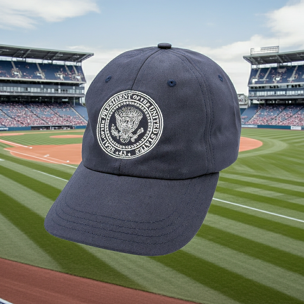 A white baseball cap featuring the Seal of the 43rd President of the United States.
